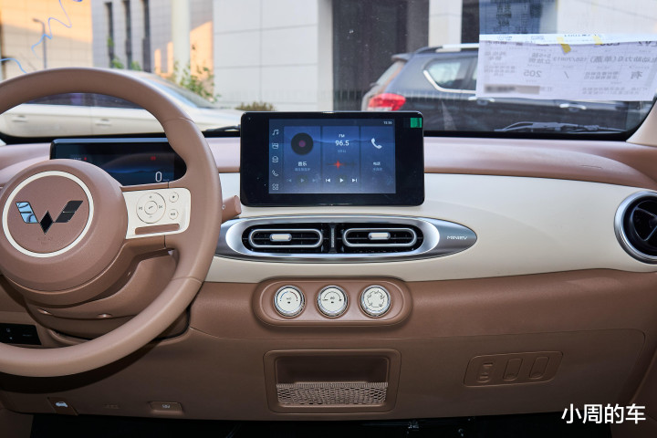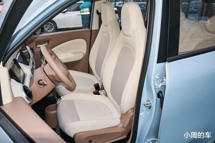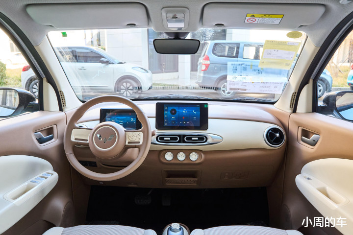 来到车内,五菱宏光MINI EV四门版的中控台、方向盘以及门板主体采用了焦糖配色,中间夹杂着奶酪白色进行点缀,整体呈现出可爱活泼的风格,跳跃的配色带来的另一个好处便是即便车内采用了大量的塑料材质,但是看起来并不显廉价。科技感方面,新车采用了7英寸液晶仪表+8英寸悬浮式中控屏的组合,车机的功能不算丰富,仅支持蓝牙电话、音乐播放以及收音机等功能。