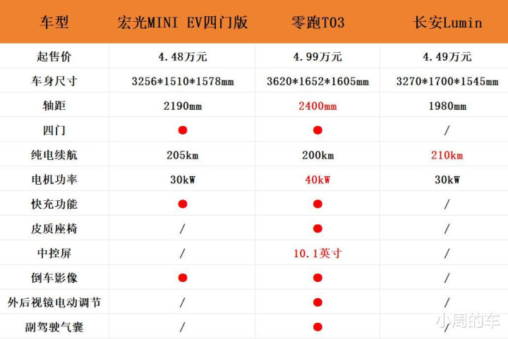 横向对比来看,五菱宏光MINI EV四门版上市后的竞争对手也将锁定为尺寸相当的长安Lumin以及同为四门版的零跑T03。