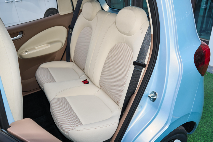 车身侧面为四轮四角式布局,对于小尺寸车型来说,这样的设计比较常见,它的好处是能够将车内空间最大化,同时也在一定程度上增加行车的稳定性。受制于成本的影响,该车仍旧采用的是钢制轮毂,外面是“五叶草”样式的白色罩壳,为车身增添了时尚感。