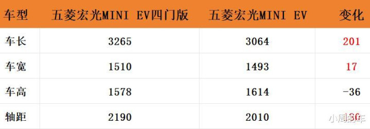 车身尺寸方面,五菱宏光MINI EV四门版的长宽高分别是3256*1510*1578mm,轴距是2190mm,相比于现款车型,新车的车长增加了201mm,车宽增加了17mm,轴距则是多出了180mm。轴距的加长使得新车的后排乘坐空间有了明显的改善,身高1米78的乘客坐进去,腿部空间还有富余,多人出行也不会感觉拥挤,后车门的加入则是让后排乘客可以更为方便的上下车,如果说五菱宏光MINI EV像是一台大玩具,那么四门版车型给人的感觉更像是一台正儿八经的家用小车。